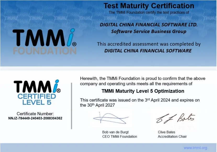 近日,神州信息子公司——BB贝博艾弗森融信软件有限公司(下文简称“BB贝博艾弗森融信”)通过TMMi(测试能力成熟度模型集成)最高级别5级国际权威认证,成为国内同时获得TMMi5级认证和CMMI5级认证的企业,覆盖咨询、产品需求、软件开发、测试、运维全流程的IT软件研发及服务。