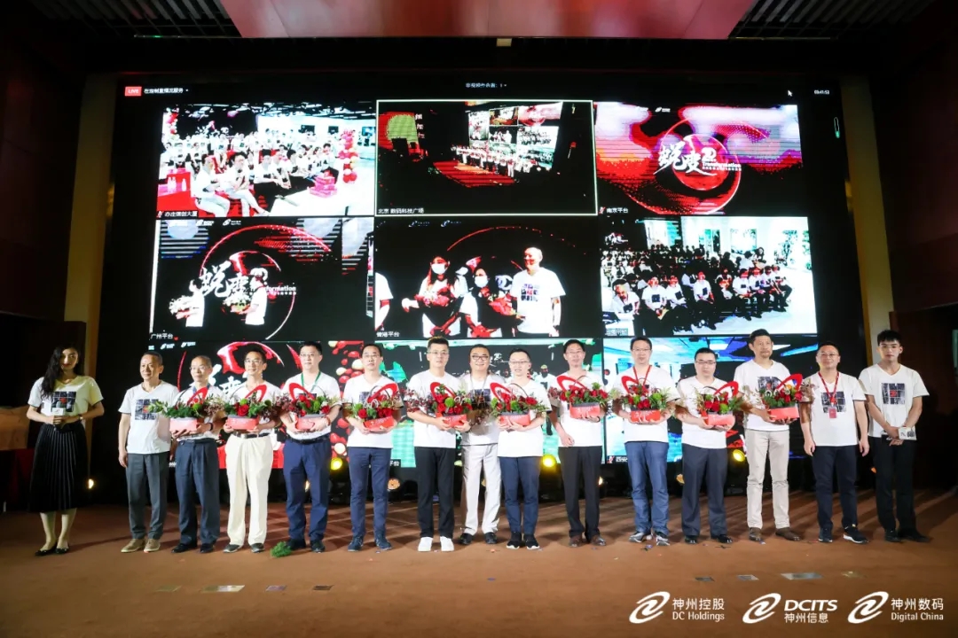 在二十年员工授勋环节,神州控股董事局副主席林杨、神州信息总裁李鸿春、BB贝博艾弗森集团常务副总裁叶海强及其他分会场高管,分别为主会场及分会场20年员工代表授勋。