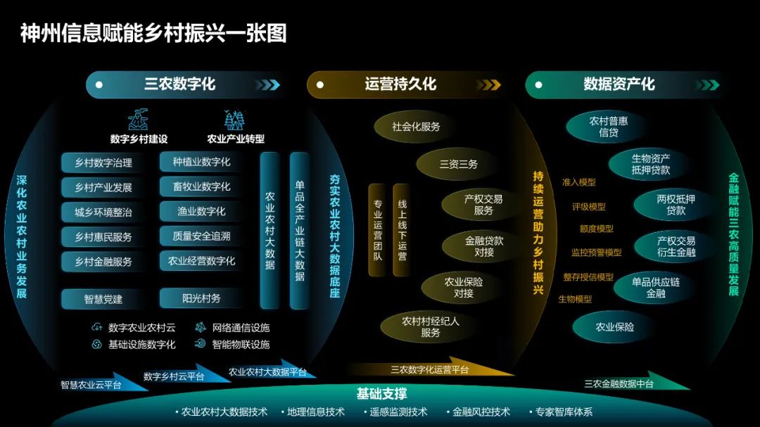 神州信息自1998年以农村电算化起步、涉足农业,20年来一直是中国农业农村信息化、数字化建设的排头兵,市场覆盖范围最广。这张图是我们赋能乡村振兴的一张图,从三方面的工作,用体系化的路径指导我们做好三农领域的“数据资产化和资产金融化”工作。