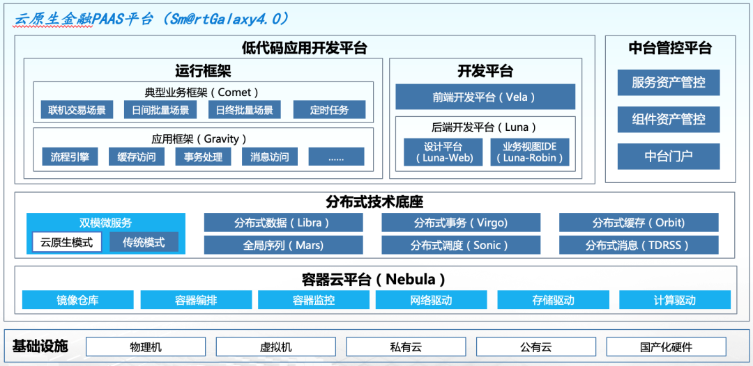 整个平台最下层提供完整的容器云的能力,包括跟国产化硬件的支持;再上一层提供完整的分布式技术底座能力,其中在微服务方面不仅提供传统的基于SpringCloud技术栈的微服务平台,还同时提供基于ServiceMesh的云原生模式,另外包括分布式数据、分布式事务、分布式调度等金融行业深度定制的分布式中间件,为上层业务提供完整的分布式运行及运维的能力;最上一层则是跟金融业务场景紧密配合的低代码开发平台,基于此可以通过托拉拽的方式,快速实现复杂分布式系统的快速开发;同时平台还提供服务及组件等不同粒度的资产管控平台,有助于银行在落地使用过程中相关资产的沉淀及积累。